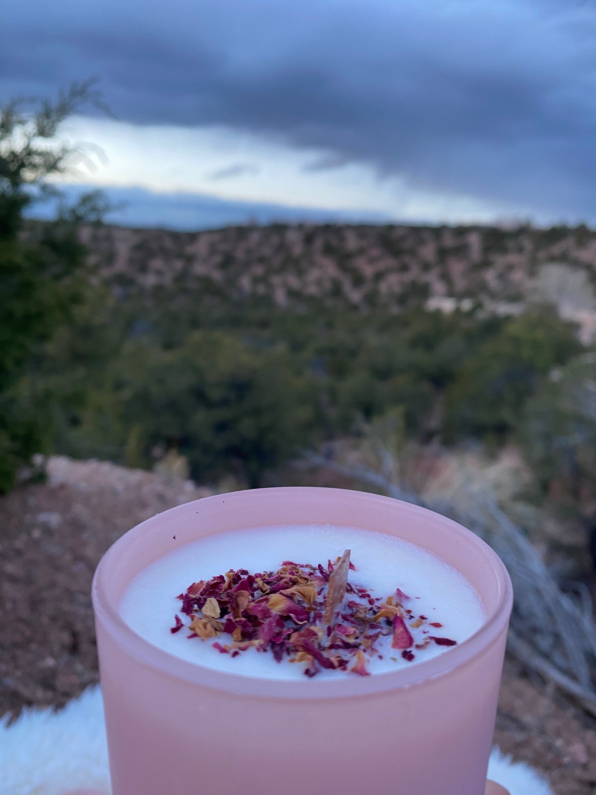 rose scented candle in a matte frosted pink 8 oz glass vessel sprinkled with dried rose petals